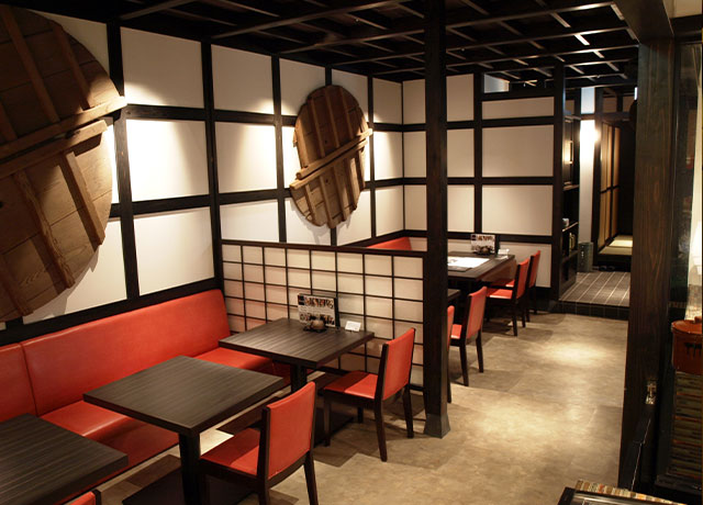 私たちは“朝日酒造のお酒を楽しみ、お酒とともに醸 してきた風土も伝える”ということを心がけ、それら を総称して「酒蔵スタイル」と呼んでいます。それ は酒蔵を模した居心地のよい空間にも表れていま す。店内に入ると壁には昔の酒樽の蓋、そのまま進 み座敷に向かうと昔ながらの瓦屋根の酒蔵、通路に は実際に使っていた麹蓋を使った額、いろいろな部 分が落ち着いた居心地の良い、そして少し懐かしい 空間がそこに広がっています。