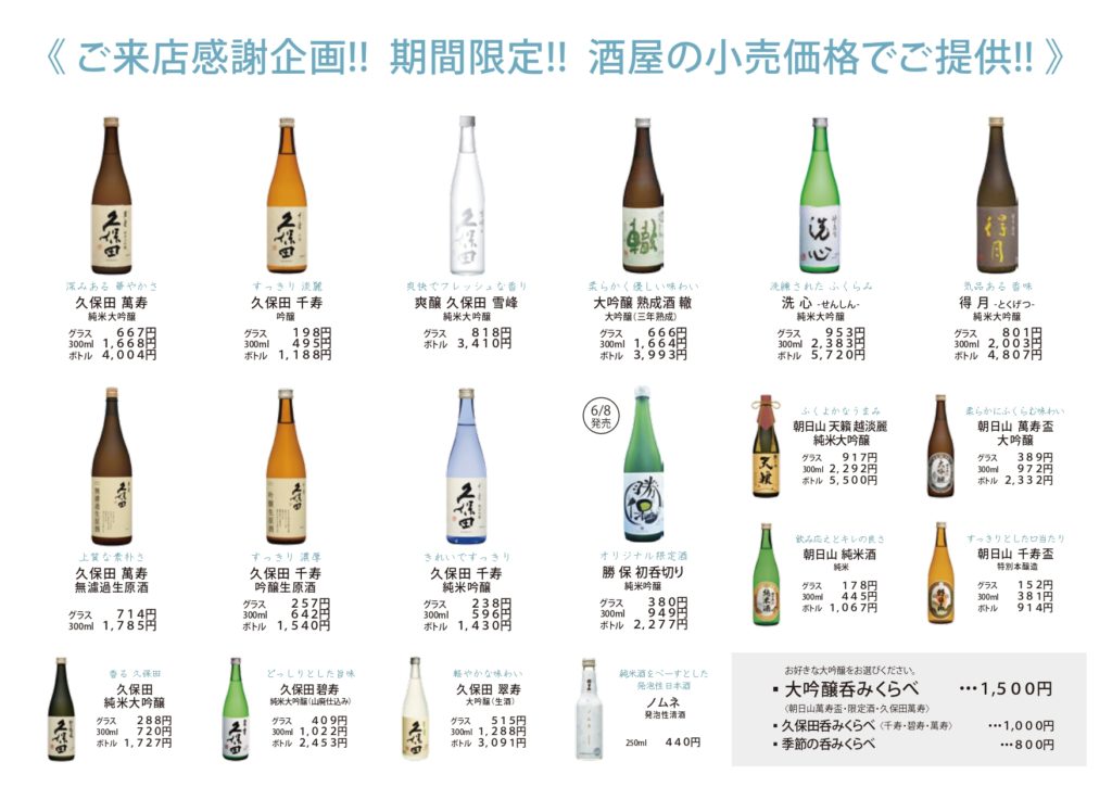「洗心」、「得月」などの高級酒を酒屋の小売価格でご提供しますので、まだご来店されていない方はぜひこの機会にご利用ください!