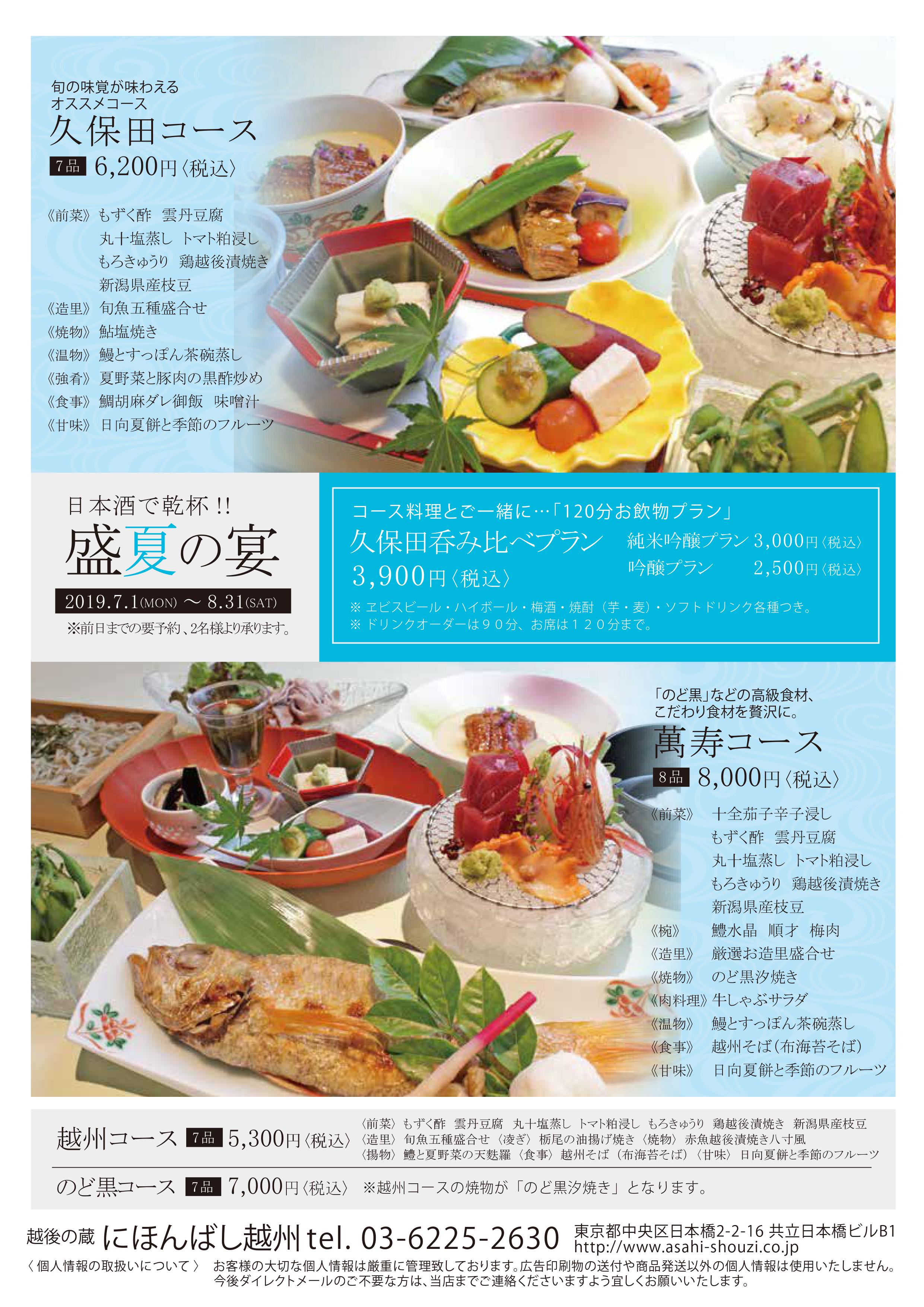 越後の蔵 にほんばし越州店では、「日本酒で乾杯 !! 盛夏の宴」と題しまして、旬の食材を使った各種コースをご用意いたしました。
