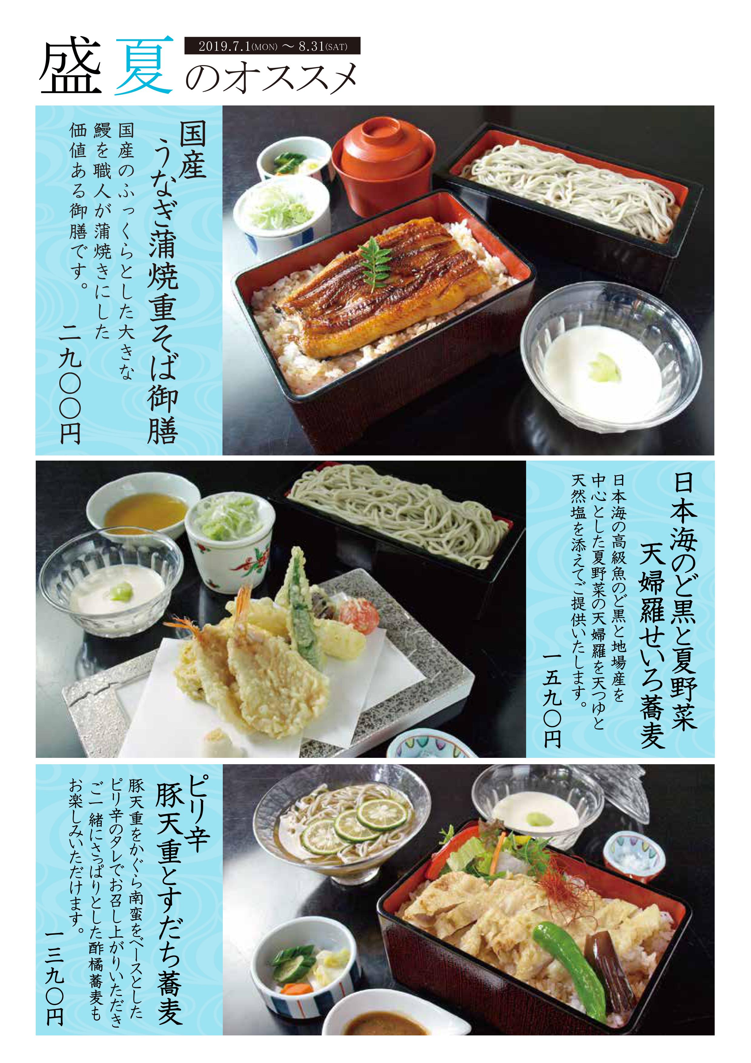 あさひ山 蛍庵では、盛夏の宴として『国産うなぎ蒲焼重そば御膳』『日本海のど黒と夏野菜天婦羅せいろ蕎麦』といった、