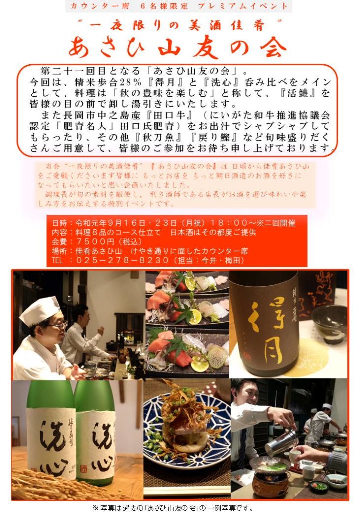 【9月16日、23日】一夜限りの美酒佳肴 ~あさひ山友の会~