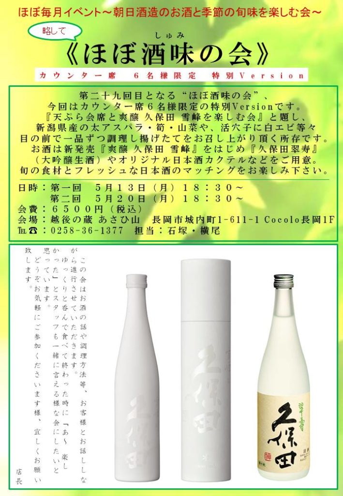【5/13・5/20】〜天ぷら会席と爽醸 久保田 雪峰を楽しむ会〜 ほぼ酒味の会